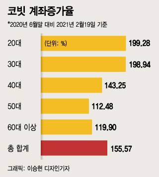 지난 18일 기준 전체 계좌수도 지난해 6월말보다 155.7% 늘었다. 특히 20~30대 연령층에서 200% 가까운 증가율을 보였다. 구체적으로 20대는 199%, 30대 199%, 40대 143%, 50대 112%, 60대 이상 120%씩 계좌수가 늘었다. 업계에선 다른 가상자산 사이트 현황도 코빗 데이터와 비슷한 것으로 본다.