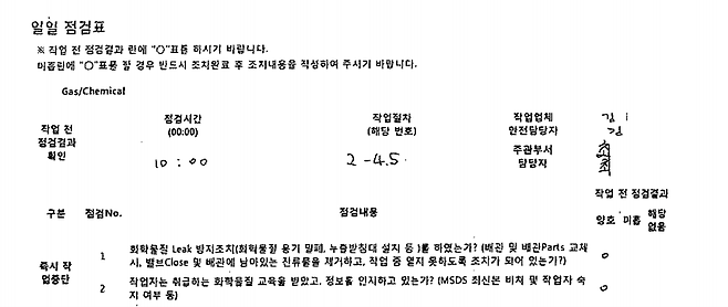 작업 위치도 사고 장소인 MR 5층(CR 3층의 상부)을 명시하고 있습니다. 또 당일 오전 10시에 진행된 일일 점검표를 보면 화학물질 Leak(누출)의 방지조치 여부에 대해 '양호' 칸에 ○를 기재한 것도 보입니다.