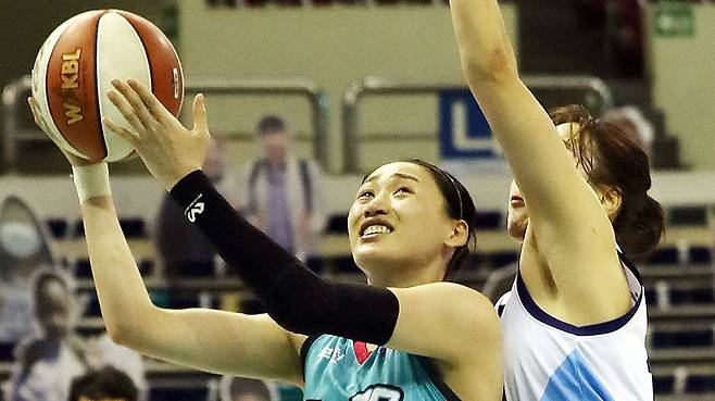강이슬은 2쿼터 2분 27초를 남기고 또 하나의 3점포로 40대 18을 만들었고, 3쿼터 종료 3분 35초 전엔 58대 36으로 달아나는 3점 슛을 추가해 무득점으로 침묵한 김아름과의 격차를 벌렸습니다.