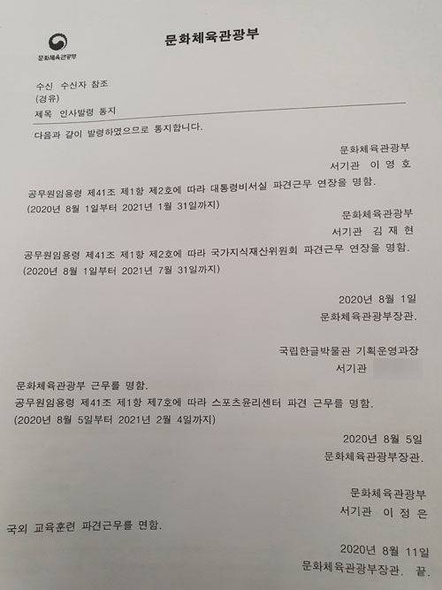 2020년 8월 당시 문체부의 발령대로 A 씨는 지난 2월 8일자로 국립현대미술관 과장에 임명됐습니다. 인사권자는 역시 박양우 문체부 장관이었습니다. A 씨는 이렇게 1년 사이에 국립한글박물관과 스포츠윤리센터, 국립현대미술관 3곳을 전전한 것입니다.