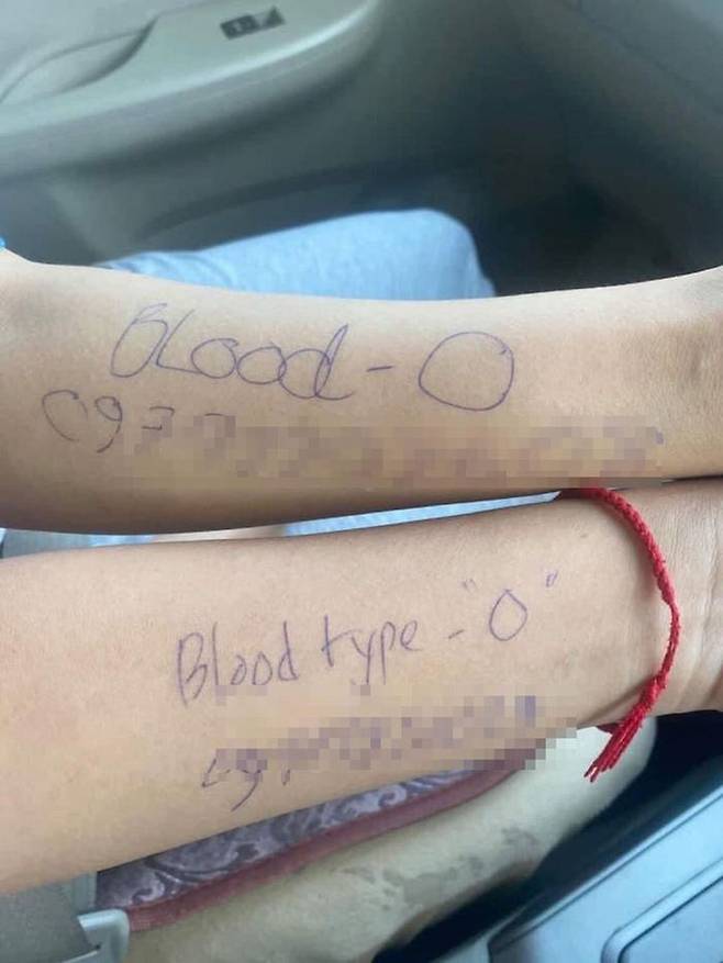 '혈액형 B, 긴급연락처 000-0000-0000, 엄마 사랑해'