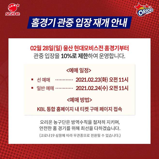 프로농구 오리온이 오는 28일 경기도 고양체육관에서 열리는 현대모비스와 홈 경기부터 관중 입장을 재개합니다.