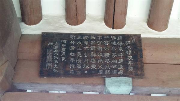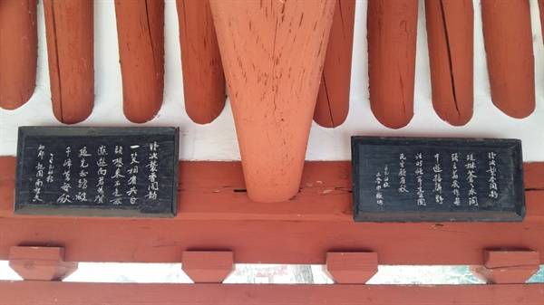 | ▲ 습향각에 걸려 있는 신철균과 남계룡의 현판. 신철균의 시 마지막 연에 “나라의 민생을 걱정하여 풍년 가을이 오기를 원하네”라는 대목이 있다 |