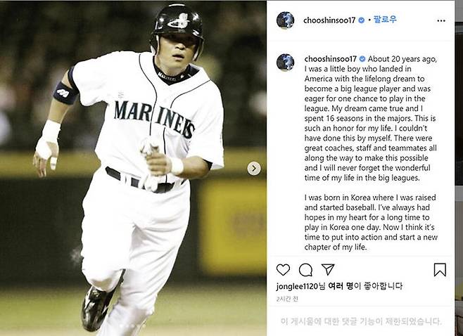 추신수는 빅리그에 데뷔하던 시절 시애틀 매리너스의 유니폼을 입은 사진과 함께 빅리그에서 멋진 시간을 보냈고 이제 한국에서 뛰고 싶다는 꿈을 이룰 때라는 내용의 영문 글을 올렸습니다.