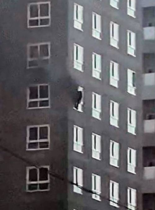 ▲ 벽에 매달려 구조를 기다리는 작업자