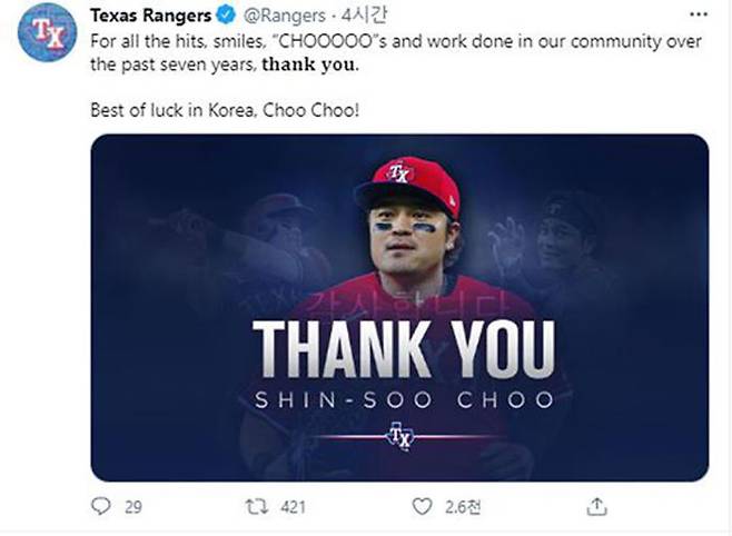 텍사스 구단은 구단 트위터 공식 계정을 통해 "추신수가 지난 7년 동안 보여줬던 안타, 미소, 우리 사회를 위해 해왔던 일들을 잊지 못할 것"이라며 "한국에서도 행운을 빈다"고 전했습니다.