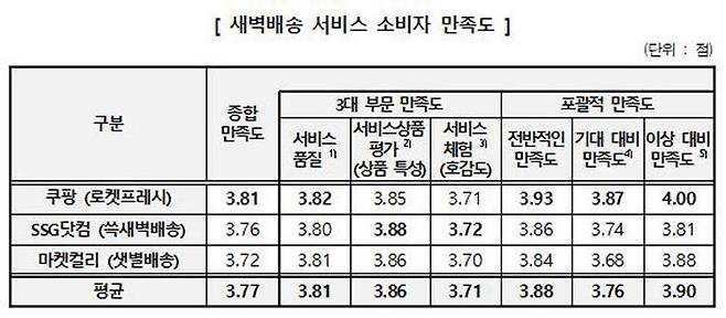 지난해 10월 15~20일 온라인으로 이뤄진 이 조사에서 쿠팡(로켓프레시)의 종합 만족도는 5점 만점에 3.81점으로 SSG닷컴(쓱 새벽배송) 3.76점, 마켓컬리(샛별배송) 3.72점보다 높았습니다.