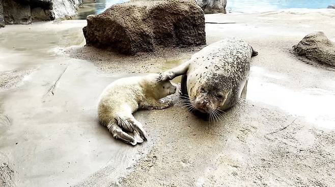 물범은 특히 모성애가 강한 동물인데 아기 물범 곁을 떠나지 않고 줄곧 보살피는 어미 물범의 모습이 인상적입니다.