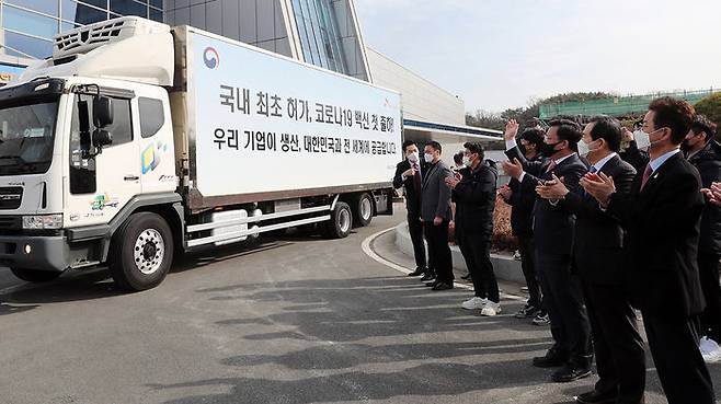 정세균 국무총리가 24일 오전 코로나19 백신 출하 현장점검으로 아스트라제네카(AZ) 국내 위탁생산업체인 경북 안동시에 있는 SK바이오사이언스를 방문해 이천 물류센터로 이송되는 백신 수송차량을 환송하고 있다.