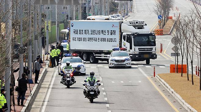 24일 오전 경북 안동 SK바이오사이언스 공장에서 생산된 아스트라제네카 백신이 수송 차량에 실려 군과 경찰의 호위를 받으며 보관장소로 이동하고 있다.