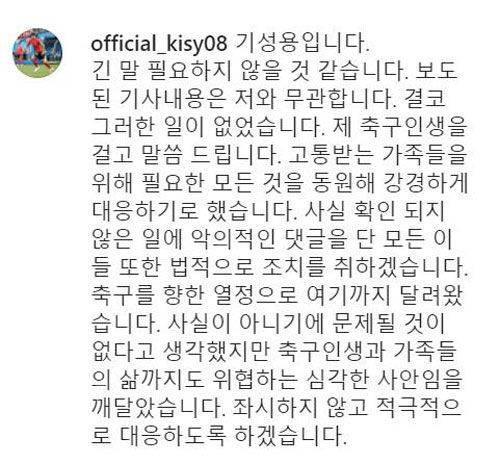 기성용은 오늘 오후 인스타그램에 "긴말 필요하지 않을 것 같다. 보도된 기사 내용은 저와 무관하다. 결코 그러한 일이 없었다"고 밝혔습니다.