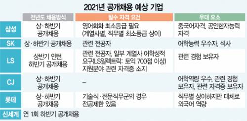 국내 주요 대기업들의 채용 방식이 정기·일괄에서 수시·직무별로 바뀌고 있지만 여전히 ‘공채’ 방식을 고집하는 기업도 적지 않다. 삼성그룹은 여전히 공채를 활용하겠다고 발표했다. SK그룹도 올해까지는 공채를 통해 직원을 선발할 예정이다. 취업준비생 입장에서는 공채와 수시채용을 동시에 준비해야 하는 어려운 상황에 놓인 셈이다.
