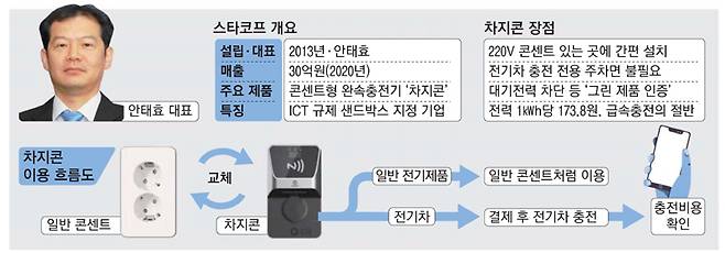 안 대표는 "전기차와 차지콘 리더기를 충전 케이블로 연결하고 미리 등록한 아파트 입주민 카드나 스마트폰 등으로 인증하면 전기차 충전이 시작되고 클라우드 서버에서 과금을 처리해 이용이 간편하다"고 말했다.