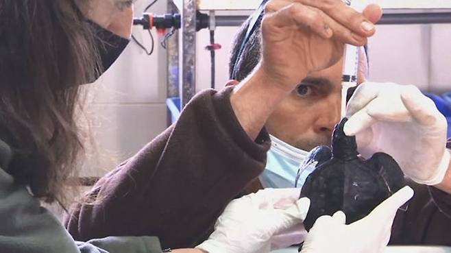 거북이들은 발견 당시 검은 타르를 잔뜩 뒤집어쓰고 있었습니다.