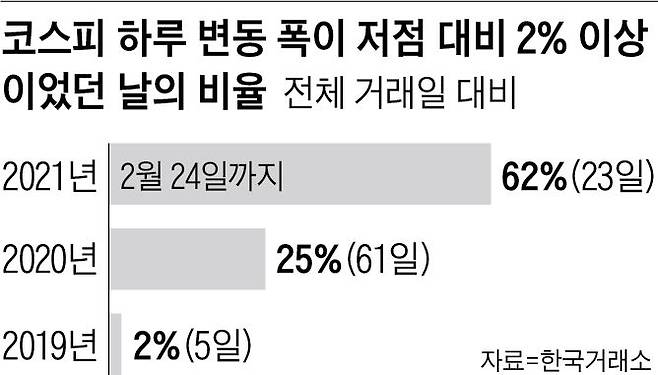 올해 들어 하루 중 변동폭이 커졌다. 작년에도 코로나 사태 여파로 주가가 급락하는 과정에선 증시 변동성이 커졌지만, 코스피 하루 변동폭이 저점 대비 2%를 넘어선 날은 61일로 전체 거래일 중 25% 정도였다. 2019년엔 변동폭이 2%를 넘어선 날이 겨우 5일(2%)밖에 되지 않았다.