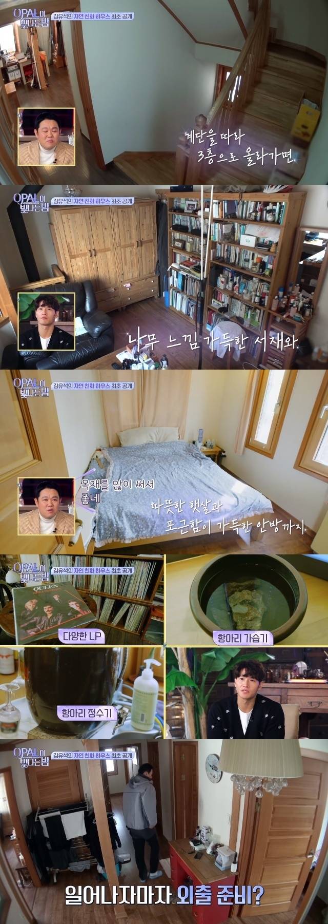 부엌은 마치 유럽같은 느낌을 자아냈고, 계단을 따라 3층으로 올라가면 역시나 나무 느낌이 가득한 서재가 존재했다. 김유석은 LP와 항아리 가습기, 정수기가 있는 포근함 가득한 안방에서 눈을 떠 하루를 맞이했다.