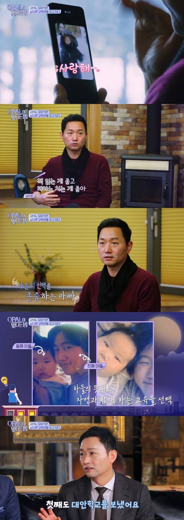 김유석은 이어 "큰 애도 대안학교를 보냈다. 대학을 보내려는 마음을 접고 아이가 하고 싶은 일을 하며 클 수 있도록. 슬픈게 우리 교육 현실이 초등학교 1학년부터 모든 것이 대학 입시를 준비하는 현실이잖나. 그것만 떨어뜨려 놓으면 아이들이 너무 행복하다"고 자신이 생각하는 교육법을 전해 눈길을 끌었다. (사진=MBC 'OPAL이 빛나는 밤' 캡처)