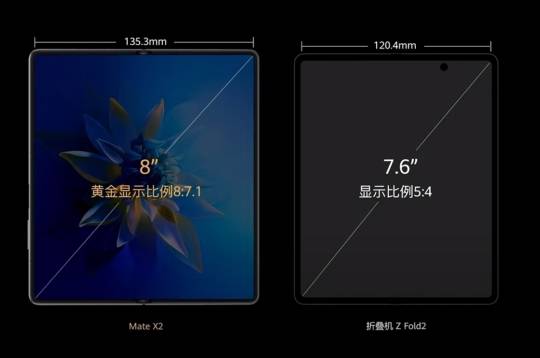 스펙상 화웨이 메이트X2는 접었을 때 6.45인치(1,160 × 2,700)에 펼쳤을 때 8인치(2,200 × 2,480) 화면을 구현합니다. 폴드2가 각각 6.23인치(816 × 2,260), 7.6인치(1,768 × 2,208)라는 점에서 물리적인 화면 크기는 메이트X2가 더 큽니다. 내부화면에 따로 전면카메라를 탑재하지 않은 풀스크린 디자인을 채택해 더 시원한 화면을 보여줍니다. 펼쳤을 때 전면카메라를 이용할 수 없다는 제약은 존재합니다.