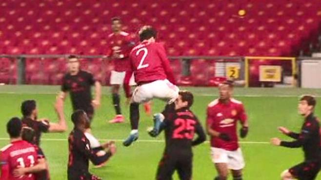 유로파리그에서 맨체스터 유나이티드의 튀앙제브가 동료의 황당한 반칙 때문에 '데뷔골'을 놓쳤습니다.