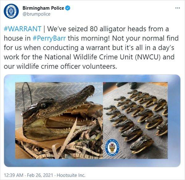 버밍엄 경찰은 제보를 받고 영국 국립야생동물범죄수사대(NWCU)와 합동 수사에 나선 것으로 알려졌습니다. 이들은 현장 급습 이후 공식 트위터 계정에 압수한 악어 머리 사진을 올리며 "우리가 영장을 집행할 때 보는 평범한 발견물은 아니었다"고 설명했습니다.