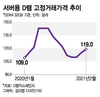 서버용 D램은 'FAANG'(페이스북·애플·아마존·넷플릭스·구글)으로 불리는 글로벌 클라우드서비스업체의 데이터센터 서버를 구축하는 데 필수적인 부품이다. 지난해 코로나19 확산에 따른 온라인 교육과 재택근무 등 비대면 특수로 가격이 1월 109달러에서 4~6월 143.1달러까지 치솟았다가 7월부터 연말까지 줄곧 하락세를 탔다.