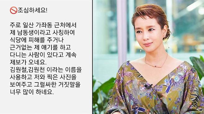 김원희 씨는 지난달 25일 SNS를 통해 자신의 남동생을 사칭하는 사람이 있다고 알렸습니다.