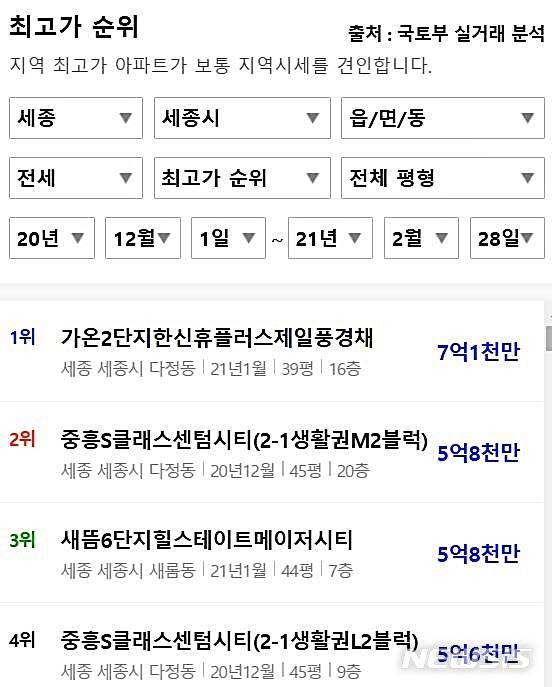 일례로 지난달 28일 기준 세종시 전용면적 128.9㎡ 가온2단지 한신휴플러스제일풍경채 아파트 전셋값은 종전 4억원대에서 한 달만에 3억1000만원이 더 오른 7억1000만원에 계약됐다. 해당 아파트 최근 매매 가격은 10억2000만원으로 매매가 대비 전세가격이 70% 수준이다.