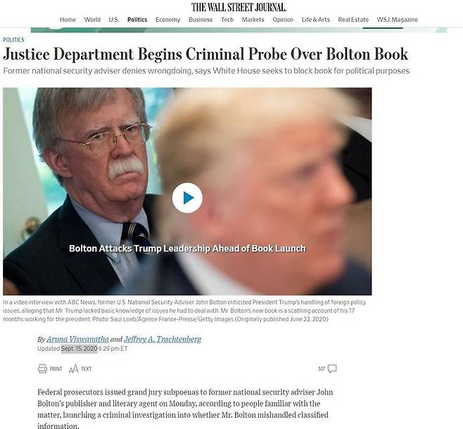 3. 존 볼턴 전 국가안보보좌관의 회고록에 대한 연방검사의 수사를 다룬 [월 스트리트 저널] 기사