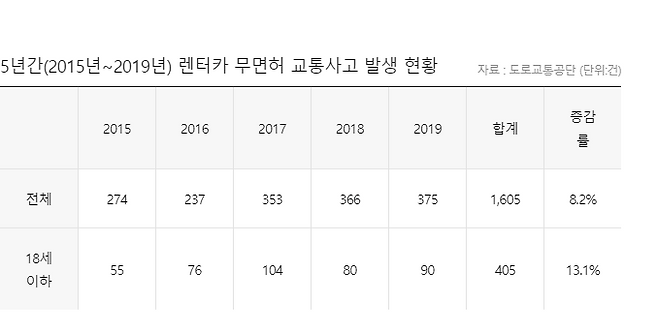 통계상으로도 ‘무면허 10대 렌터카’ 문제는 날로 심각해지고 있다. 도로교통공단 교통사고분석시스템(TAAS)에 따르면 2015년부터 2019년까지 5년 동안 10대 무면허 렌터카 교통사고는 405건 발생했고, 이로 인해 사망자 8명과 부상자 722명이 나왔다. 이 기간 사건도 매년 13%씩 증가해, 최근엔 한 해 100건 가까이 사고가 발생하고 있다.