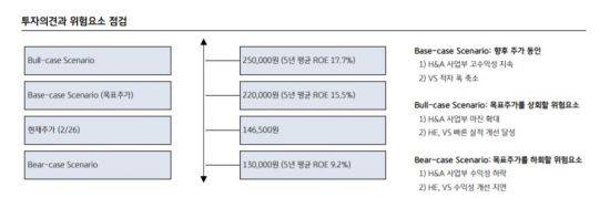 LG전자 주가는 MC 사업을 계속 유지할 수 있다는 우려로 지난달 17일 17만6000원에서 같은 달 26일 14만6500원으로 16.8% 하락했다. 하지만 MC 사업 불확실성은 긍정적 사업 방향으로의 재편을 통해 빠르게 완화될 것이라는 전망이다. MC 사업의 매각 협상이 결렬된다고 가정해도 6년간 적자를 기록한 MC 사업의 유지 가능성이 희박하고, 다수의 글로벌 업체들이 MC 인수