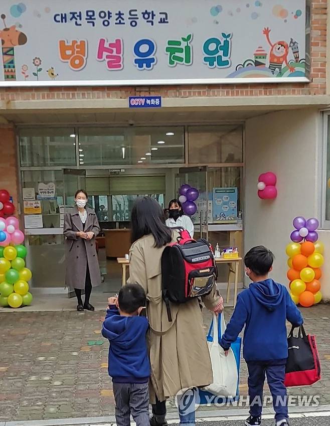 (대전=연합뉴스) 조성민 기자 = 신종 코로나바이러스 감염증(코로나19) 상황에서 전국 유치원과 초·중·고교의 2021학년도 신학기 첫 등교가 시작된 2일 오전 대전목양초 병설유치원 선생님들이 엄마 손을 잡고 등교하는 아이들을 반갑게 맞고 있다. 2021.3.2