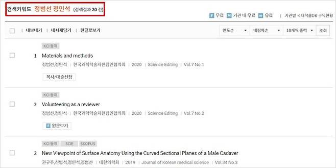 학술연구정보서비스(RISS) 검색 결과, 실제로 '정범선' 이름으로 검색되는 학술지 논문 34개 중 20개는 아버지 정민석 교수와 공저자인 논문으로 확인됐습니다.