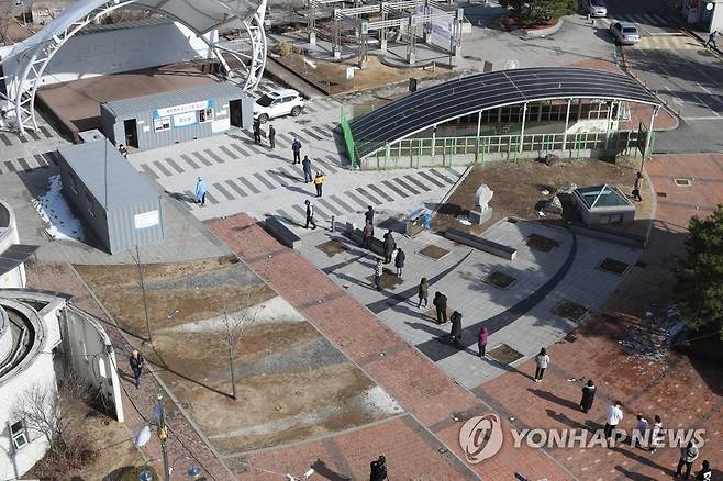 (동두천=연합뉴스) 임병식 기자 = 2일 경기도 동두천시 중앙도심공원 임시선별진료소에서 시민들이 신종 코로나바이러스 감염증(코로나19) 검사를 받기 위해 줄지어 기다리고 있다. 2021.3.2