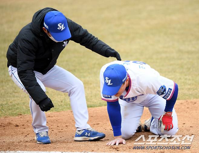 롯데 자이언츠와 삼성 라이온즈의 연습경기가 3일 대구 삼성라이온즈파크에서 열렸다. 7회초 1사 2루, 롯데 나승엽의 투수 앞 강습타구때 수비를 펼치던 삼성 1루수 이성규가 부상으로 고통스러워 하고 있다. 대구=허상욱 기자 wook@sportschosun.com/2021.03.03/