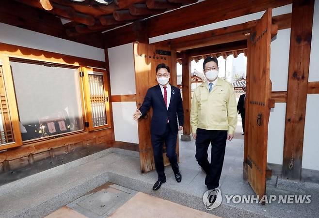 (인천=연합뉴스) 윤태현 기자 = 황희 문화체육관광부 장관(오른쪽)이 3일 오후 인천시 연수구 경원재 앰배서더 호텔에서 한 객실의 방역 상황을 점검하고 있다. 황 장관은 이날 신종 코로나바이러스 감염증(코로나19) 확산에 따른 호텔업계 대응을 점검하기 위해 이곳을 찾았다. 2021.3.3