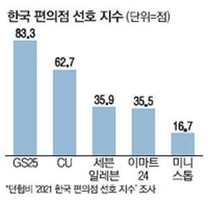 특히 2위 CU와 3위 세븐일레븐 간 격차(26.8점)가 상당해 국내 편의점 시장은 GS25와 CU의 양강구도가 유지되는 것으로 확인됐다.