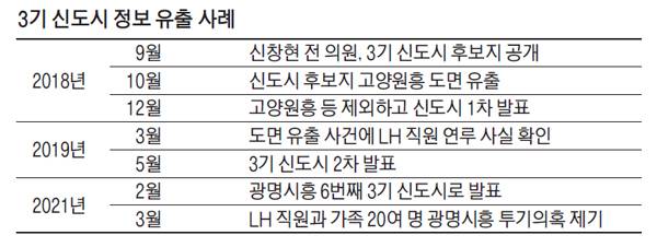 3기 신도시와 관련한 정보 유출 논란은 정부가 9·21 대책(2018년)을 통해 3기 신도시 조성계획을 밝히자마자 시작됐다. 신창현 전 더불어민주당 의원이 광명 안산 등을 포함한 3기 신도시 후보지 8곳을 공개한 것. 국토부가 자체 조사한 결과 LH 직원이 후보 대상지를 지자체와 국회의원실에 넘겼고 이 목록이 그대로 공개된 것으로 확인됐다. 정부는 그해 12월 하남교산 등 3기 신도시 1차분을 발표하면서 당시 문제가 됐던 지역을 모두 제외시켰다.