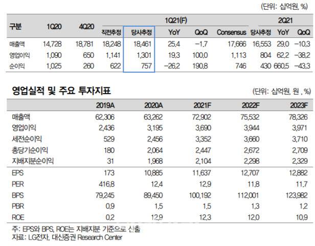 박강호 대신증권 연구원 “2021년 1분기에 깜작 실적을 예상하며 영업이익(연결)은 1조 3000억원으로 역대 분기 최고치, 컨센서스를 상회할 전망”이라며 “가전(H&A)은 식기세척기, 건조기, 무선청소기 등 신성장 중심으로 판매 증가, 평균판매가격(ASP) 상승으로 영업이익률 13.9%를 예상한다”고 말했다. 이어 “TV(HE)는 액정표시장치(LCD) 패널 가격 상승 부담은 존재하나 매출이 33.6%(yoy) 증가 속에 OLED TV 매출 비중 확대로 종전대비 상회한 영업이익률은 7.6%로 추정한다”며 “특히 LG이노텍(011070)의 호실적(영업이익 2910억원 추정)이 반영돼 전체 매출은 18.46조원으로 25.4%(yoy) 증가할 전망”이라고 덧붙였다.