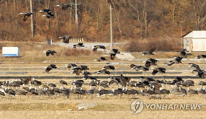 (서산=연합뉴스) 4일 충남 서산시 천수만 간척지에서 천연기념물 제228호이자 멸종위기야생생물 Ⅱ급인 흑두루미 떼가 먹이활동을 하고 있다. 이 흑두루미 떼는 일본 이즈미시와 전남 순천 등에서 월동한 뒤 북상 중 에너지 축적을 위해 기착한 것으로 파악됐다. 2021.3.4 [서산시 제공. 재판매 및 DB 금지]