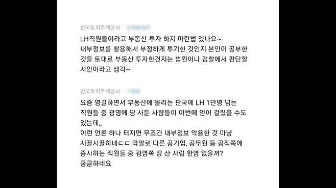 또 다른 직원은 "1만 명 넘는 LH 직원 중 광명에 땅 사둔 사람들이 이번에 얻어걸렸을 수도 있다"며 "하나 터지면 무조건 내부정보 악용한 것마냥 시끌시끌하다"고 적었습니다.