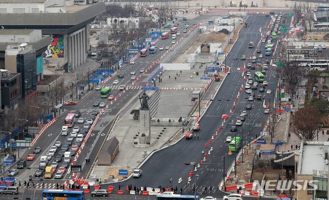 [서울=뉴시스]이영환 기자 = 6일 0시부터 광화문광장 동측도로(교보빌딩 앞)가 양방향 통행으로 바뀌는 가운데 4일 오후 서울 종로구 광화문광장에서 관계자들이 작업을 하고 있다. 서측도로(세종문회화관 앞)는 11월까지 광장에 편입돼 세종대로 사람숲길과 연계된 도심 보행길로 변신한다. 2021.03.04. 20hwan@newsis.com