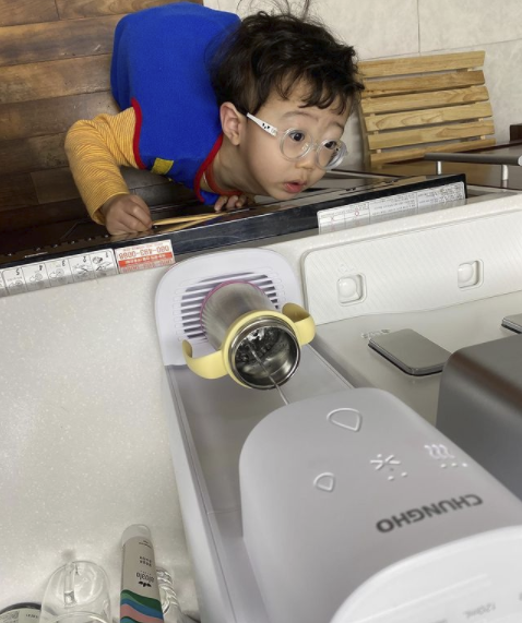 함께 올린 사진에서 김미려의 아들 정이온은 정수기를 하염없이 올려다보며 호기심 어린 눈을 하고 있다.