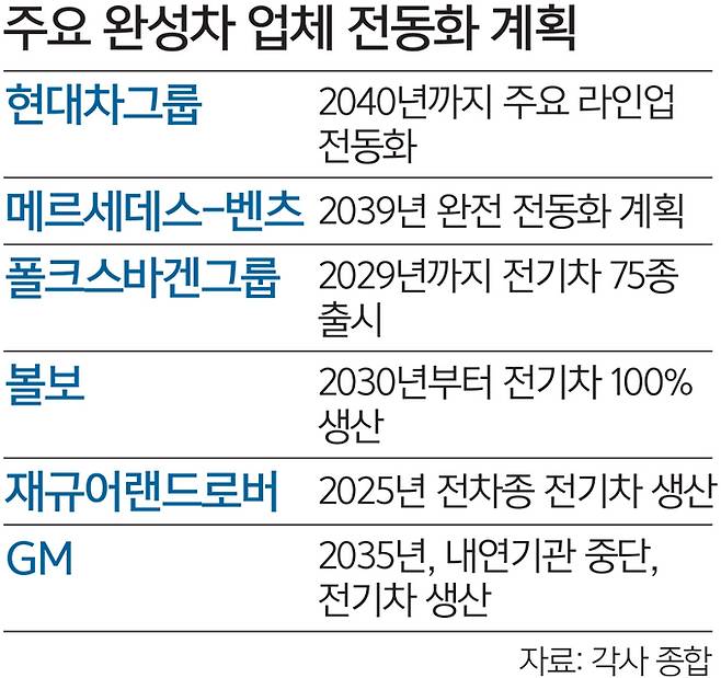 주요 기업들의 전동화 전환이 속도를 내는 까닭은 각국 정부가 내세우는 환경 규제가 점차 까다로워지기 때문이다. 영국은 2030년부터 내연기관 신차 판매를 중단하고, 2035년에는 하이브리드차까지 판매를 금지할 방침이다. 노르웨이는 2025년, 프랑스는 2040년부터 내연기관 차량의 판매를 중단한다. 국내에서도 대통령 자문기구인 국가기후환경회의가 2035∼2040년쯤 국내 내연기관차 판매 중단을 제안한 바 있다.