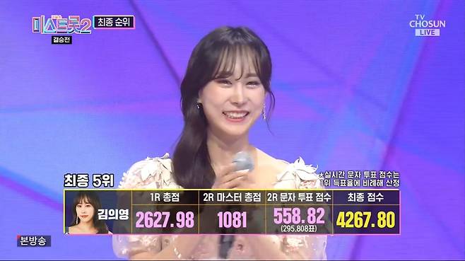 5위는 김의영이 이름을 올렸다. '미스트롯1' 탈락 직후 '미스트롯2' 출연을 결심했다는 그는 나훈아의 '물레방아 도는데'를 선곡, 5년간 트로트 가수가 되기 위해 연습하며 무대를 찾아다녔던 노력을 목소리로 담아냈다.