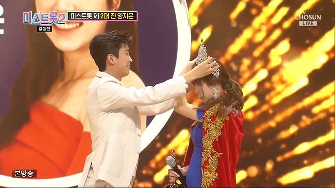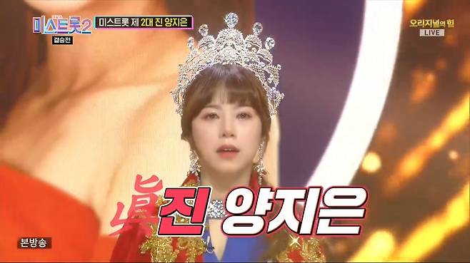 '미스터트롯' 眞 임영웅으로부터 왕관을 전해받은 양지은은 "오늘 몇 등이 되어도 울지 않겠다고 다짐했었다. 동료들과 함께 고생했고 TOP7 모두 잘하는 친구들이라 '축하해주고 싶다'고 마음을 먹고 무대에 올랐다. 그런데 저에게 이런 큰 상을 주셔서 감사하다"고 소감을 전했다.