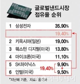 시장조사업체 옴디아에 따르면 2019년 말 기준 글로벌 낸드플래시 시장 점유율에서 삼성전자가 35.9%로 1위, SK하이닉스가 9.9%, 인텔이 9.5%다. SK하이닉스가 인텔 낸드플래시 사업부를 인수하면 단순 계산할 때 시장점유율 20%로 키옥시아(19%)를 제치고 삼성전자에 이어 글로벌 2위 자리로 도약하게 된다.