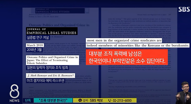하버드 램지어 교수의 위안부 피해자 왜곡 논문에 대한 보도를 한 게 거의 한 달 가까이 돼 가면서 한국 역사를 왜곡하는 논문이 설마 또 나오겠냐는 생각을 했던 것도 사실입니다. 하지만 일본 내 인사들이 부락민(일본에서 극심한 차별을 받았던 최하층민)에 대한 램지어 교수의 논문을 가지고 영어로 논쟁이 붙은 걸 트위터에서 우연히 발견했습니다. 내용이 궁금해서 논문을 찾아봤는데, 역시나 논문 주제와 관련도 없는 한국인 비하 발언이 나오는 것을 바로 확인할 수 있었습니다. 이 논문의 제목은 '일본의 탈락자 정치와 조직범죄'라는 제목이었는데 램지어 교수가 인디애나대 경영대 라스무센 교수와 공동 저술해 지난 2018년 3월에 실증법 연구 저널(Journal of Empirical Legal Studies)에 실었습니다.
