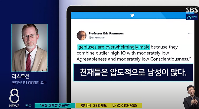 이번 취재를 하면서 알게 됐지만, 이 논문의 공동 저자 라스무센 교수는 2019년 8월 CBS, ABC 같은 미국 지상파에서 '혐오 트윗' 사건으로 대서특필됐던 인물입니다. 관련 기사를 찾아보면서 그 내용의 수위가 미국 사회에서 도무지 용납하기 어려운 인물이라는 걸 확인했습니다. 트위터에 "천재들은 압도적으로 남성이 많다"는 성차별적인 발언을 써놓기도 했고, "성소수자는 대학에 들어와서는 안 된다" 거나. "흑인 학생은 백인 학생에 비해 열등해 입학 자격이 안 된다"는 발언을 마구잡이로 쏟아냈던 인물입니다. 그러면서도 표현의 자유를 부르짖고 있어 미국에서도 대학교수의 표현의 자유를 어디까지 보장해야 하는지에 대한 격렬한 논쟁이 벌어지기도 했습니다.(램지어 사태의 미국판 선행 학습 버전이라고도 할 수 있을 것 같습니다.)
