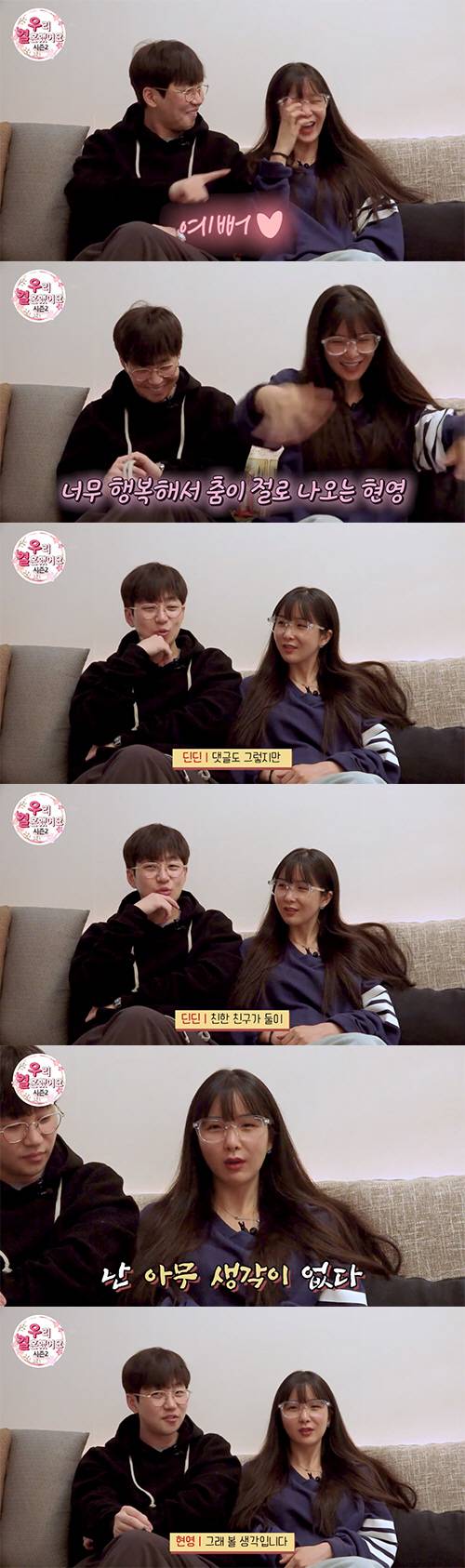 어설픈 요리실력을 자랑하던 조현영은 "나 시집 못갈 것 같다"라고 한숨을 쉬었다. 이때 딘딘이 집으로 들어왔고, "왜 아무것도 안 해줘"라며 조현영과 진한 포옹을 하는 모습을 보였다.