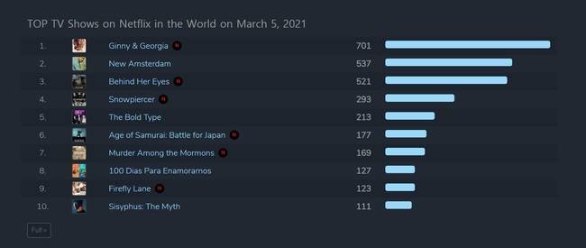 온라인 동영상 스트리밍 서비스 넷플릭스와 동시 방영중인 JTBC 10주년 특별기획 ‘시지프스: the myth’(극본 이제인 전찬호/연출 진혁)가 3월 5일 기준 넷플릭스 전세계 순위 톱10을 기록했다. (출처: FlixPatrol) TV쇼 탑10 중 비 영미권 작품으로는 유일하다.